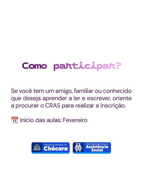 Se você conhece algum amigo, familiar ou vizinho que deseja aprender a ler e escrever, oriente a procurar o CRAS e realizar a inscrição.