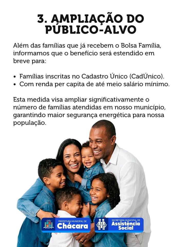 A Prefeitura Municipal de Chácara, por meio da Secretaria Municipal de Desenvolvimento Social, informa aos beneficiários do Programa Bolsa Família que receberam o Auxílio Gás neste mês sobre importantes atualizações: