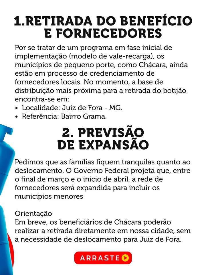 Neste momento, a base de distribuição mais próxima para retirada do botijão está localizada em Juiz de Fora (Bairro Grama). O programa ainda está em fase inicial de implementação nos municípios de pequeno porte.